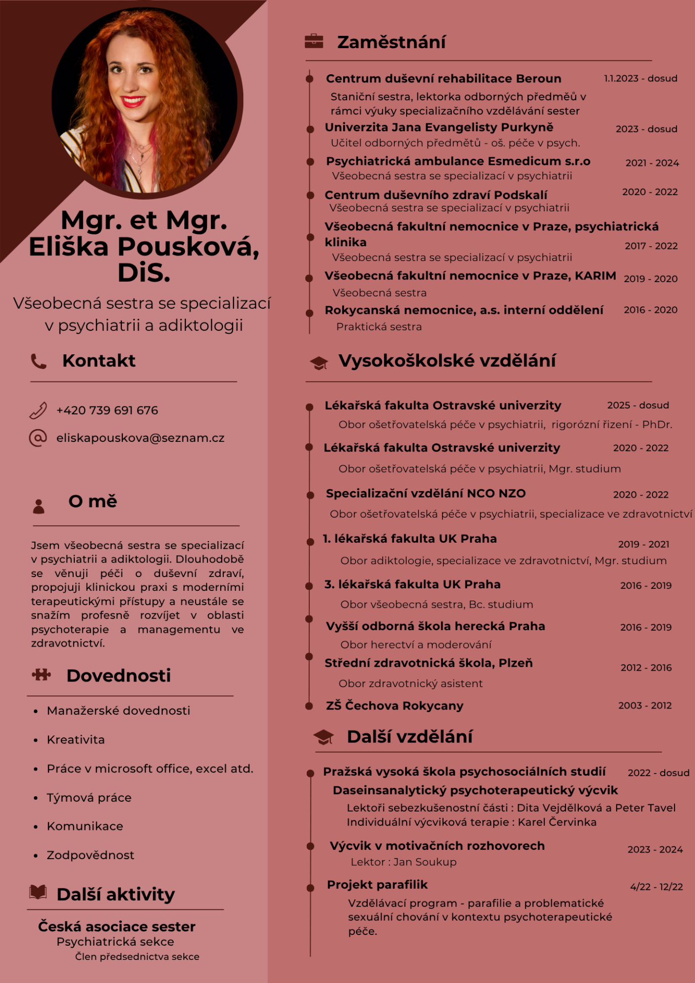 Na psychoterapeutickou práci navazuji téměř desetiletou praxí v oblasti psychiatrie, kde působím jako všeobecná sestra se specializací v psychiatrii a adiktologii. Dlouhodobě se věnuji podpoře lidí s duševním onemocněním – ať už v akutní péči, komunitních službách, nebo při vzniku nového centra duševní rehabilitace, kde aktuálně působím jako staniční sestra a mentorka. Mým profesním zájmem je podpora lidí v hledání smyslu v náročných životních obdobích, v otázkách vztahů, rodinného života, zdraví nebo motivace ke změně. Věřím, že terapie není určena jen pro ty, kdo se potýkají s diagnózou, ale i pro každého, kdo se cítí ztracený, přetížený nebo hledá nový směr. Mezi témata, kterým se věnuji, patří i problematika sexuálního zdraví a s ní související potíže.